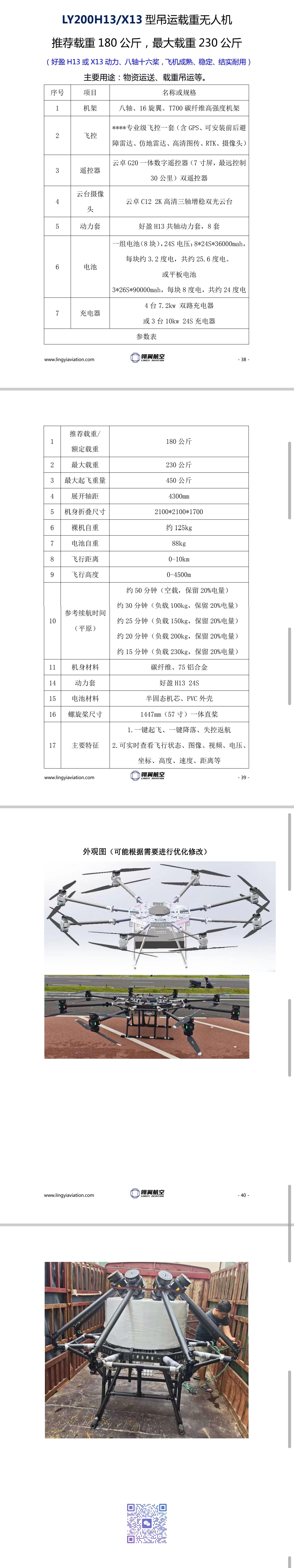 翎翼航空LY200-H13/X13型-180-230公斤载重无人机(好盈H13动力)